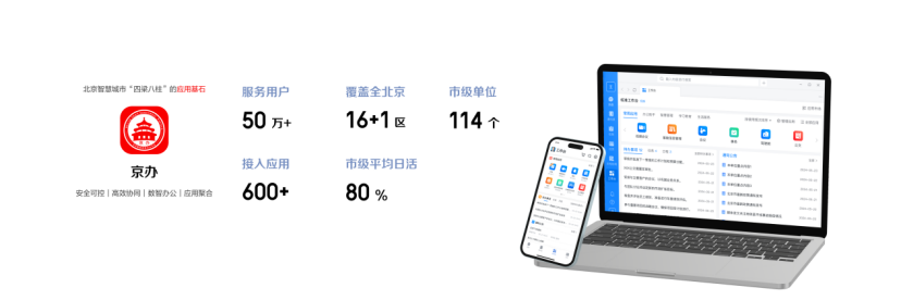 目前,京办已覆盖北京16+1个区及全部114家市级单位,注册用户数50万+(累计服务超70万用户),市级单位平均日活率超80%,有力保障北京市政务办公各类场景,全面助推首都治理体系数字化转型。
