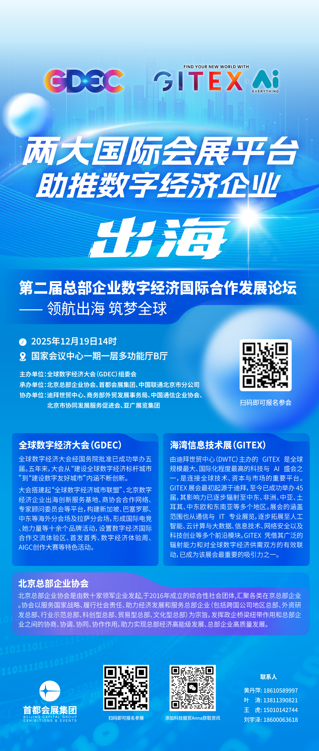 第二届总部企业数字经济国际合作发展论坛(以下简称“论坛”)将于12月19日下午在北京举办。作为2025全球数字经济大会系列活动,本届论坛以“领航出海 筑梦全球”为主题,由全球数字经济大会(GDEC)与海湾信息技术展(GITEX)两大平台联合赋能,届时业界领军人物将齐聚一堂,围绕全球数字经济的共创、共享与共生,展开深度对话与前沿思辨。